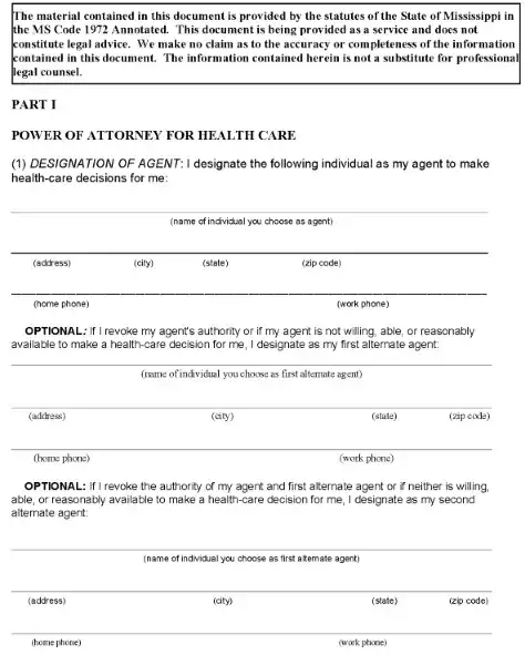 This Mississippi Medical Power of Attorney Form can be used to appoint someone else to make medical decisions on your behalf in the event that you are unable to make the decisions for yourself. In Mississippi the Medical power of attorney is called a Power of Attorney For Health Care. It is your responsibility to accurate complete the Mississippi Medical Power of Attorney Form and ensure that it is witnessed or notarized if required by state law.