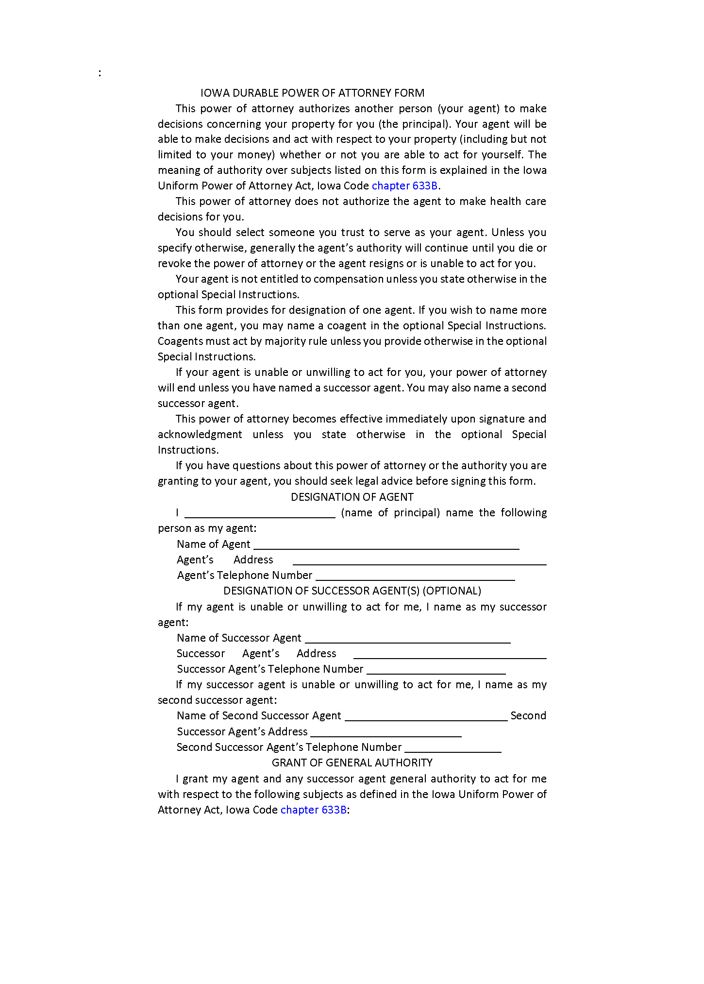 Fillable Iowa Durable Power of Attorney Form