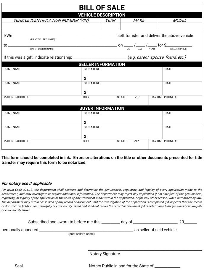 Iowa Motor Vehicle Bill of Sale For Truck or Car PDF