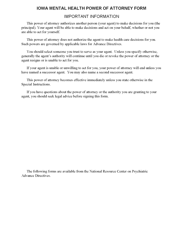 Iowa Mental Health Power of Attorney Form Word