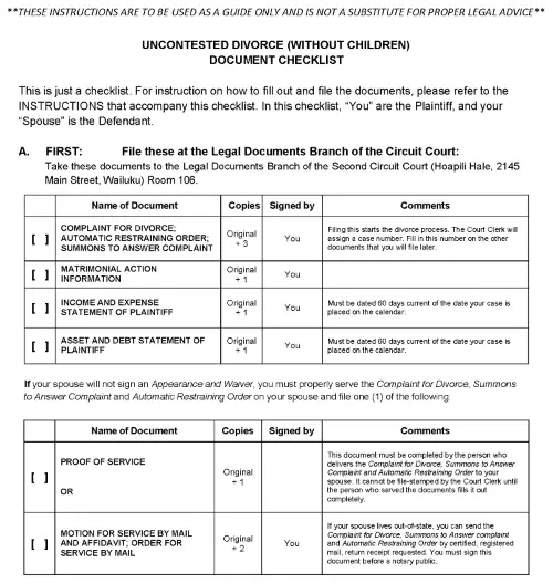 Maui Molokai or Lanai Uncontested Divorce Without Children Document Checklist PDF
