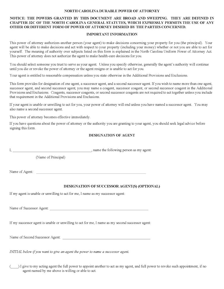 North Carolina Durable Power of Attorney Form PDF