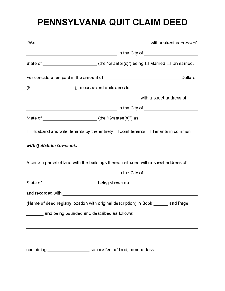 Pennsylvania Quitclaim Deed Word