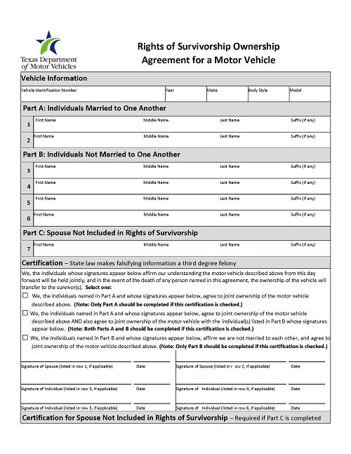 Texas Right of Survivorship Agreement For Motor Vehicle April 26, 2021Full resolution (500 × 647) ← Previous Next → Texas Right of Survivorship Agreement For Motor Vehicle Texas Right of Survivorship Agreement For Motor Vehicle