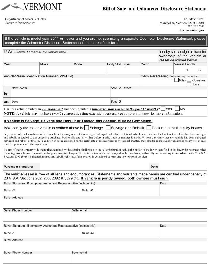 Vermont Bill of Sale For Car Form VT 005 PDF
